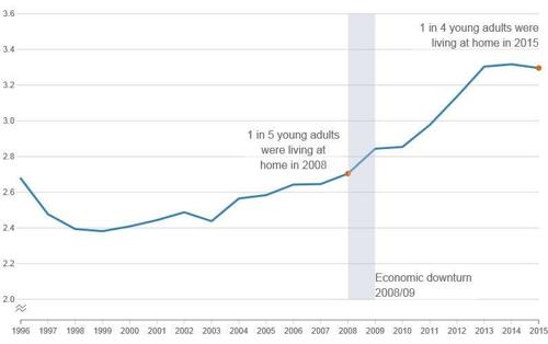 A quarter of the entire 20 to 34 age group now live with their parents in Britain, a dramatic increase from one-fifth of the age group before the global financial crisis hit in 2008.