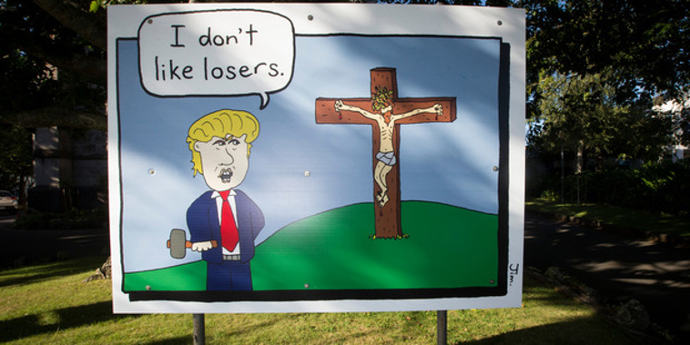 The billboard outside St Luke's Church, Remuera, depicts the Republican presidential candidate looking across at Jesus Christ nailed to the cross while holding a hammer in his hand and declaring: "I don't like losers".