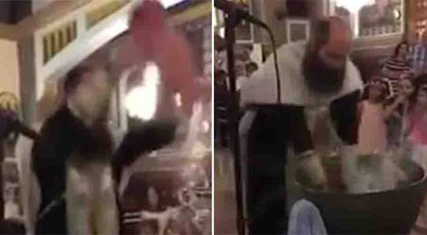 In the clip the Archbishop swings the naked child by its arms and repeatedly dunks him in the baptismal font.
