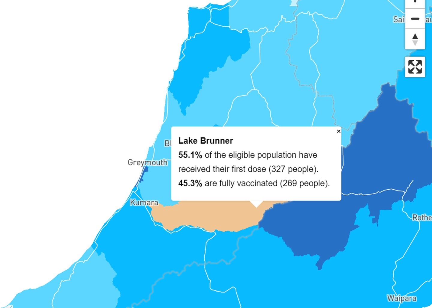 As of Wednesday, 55.1 per cent of residents in Lake Brunner had received one dose and 45.3 per cent are fully vaccinated.Â