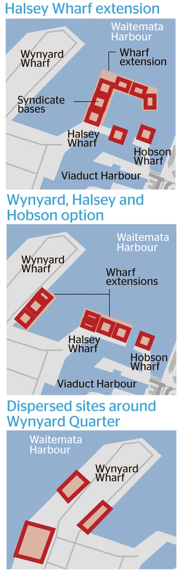 After assessing options against three criteria - ability to meet a timeframe for completion by late 2019, meet the requirements of Team New Zealand and deliver a legacy - a working group produced a shortlist of five options, which has came down to two most likely sites. These are the Halsey Wharf extension and the dispersed option across Halsey, Wynyard and Hobson wharves.