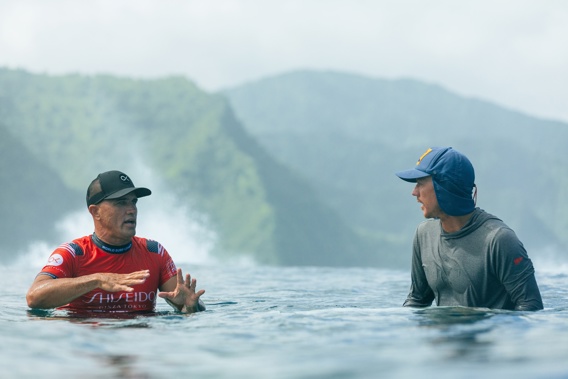 Eleven-time world champion Kelly Slater (left) at Teahupo'o, Tahiti, last year. Photo / Matt Dunbar, World Surf League via Getty Images