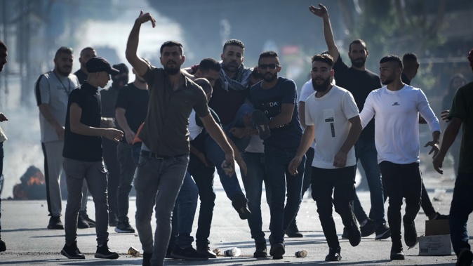 Palestinian demonstrators clash with Israeli forces following a demonstration in support of the Gaza Strip, in the West Bank city of Nablus on October 13. Photo / AP