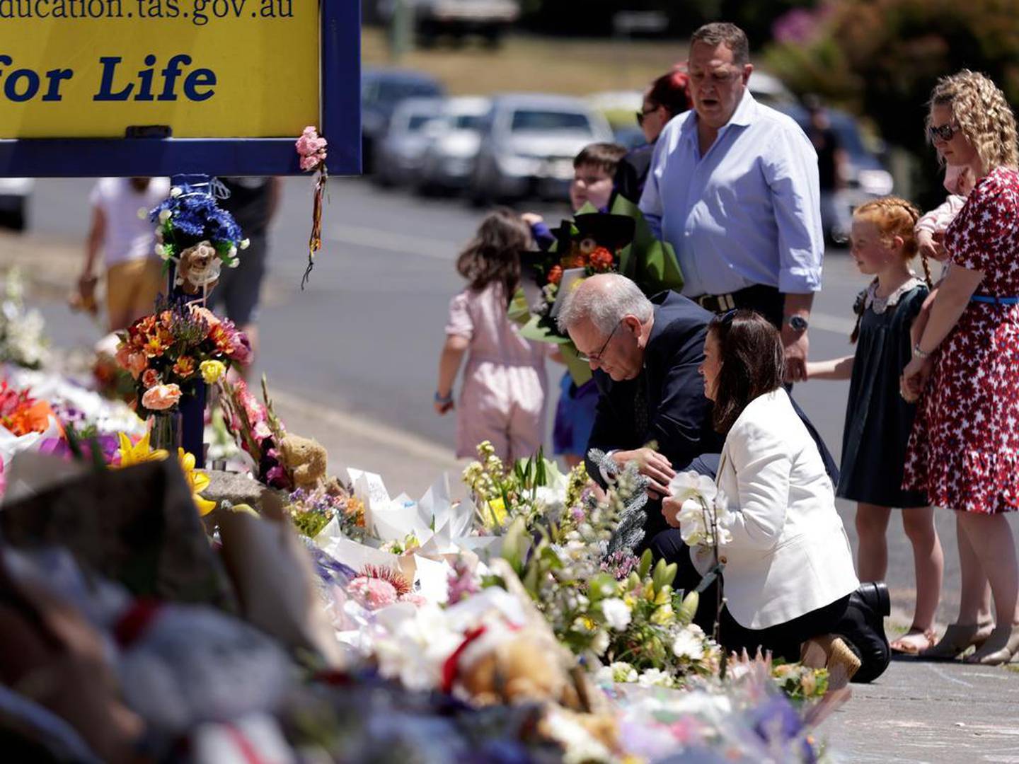 The couple privately paid their respects by laying flowers to the growing memorial outside Hillcrest Primary School in Devonport where Peter Dodt, Jalailah Jayne-Marie Jones, Addison Stewart, Jye Sheehan and Zane Mellor lost their lives.Â