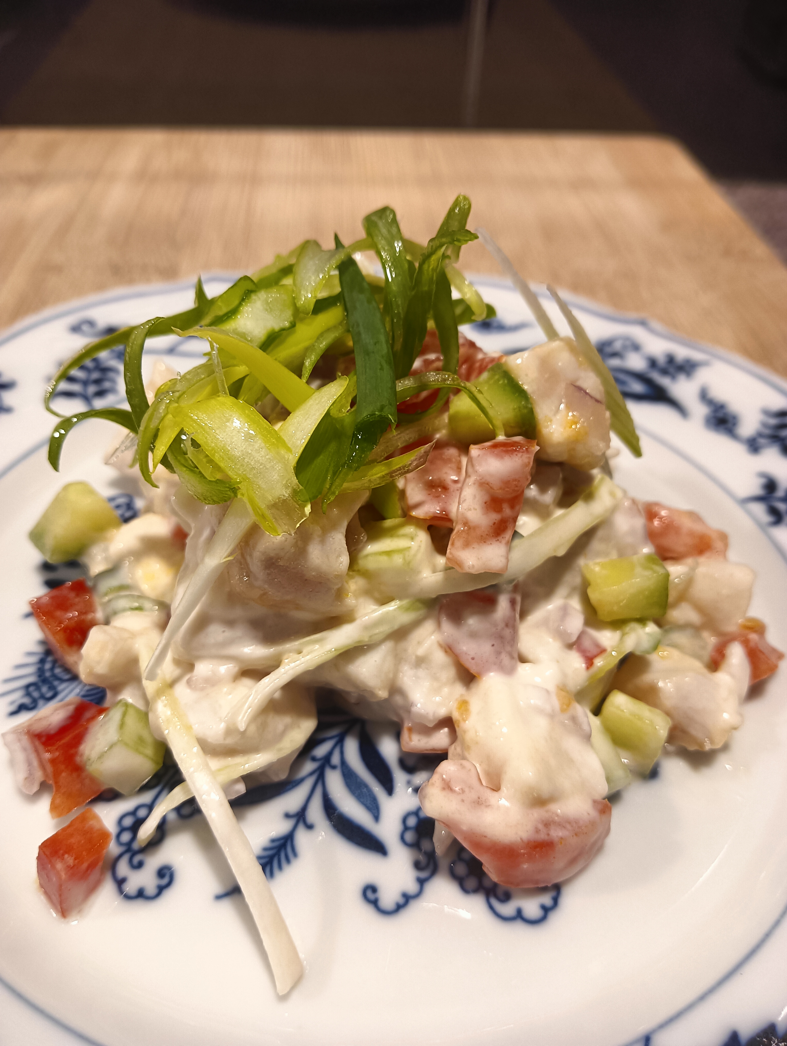 2. Prepare the diced vegetables and sliced green onions. Refrigerate.Â
