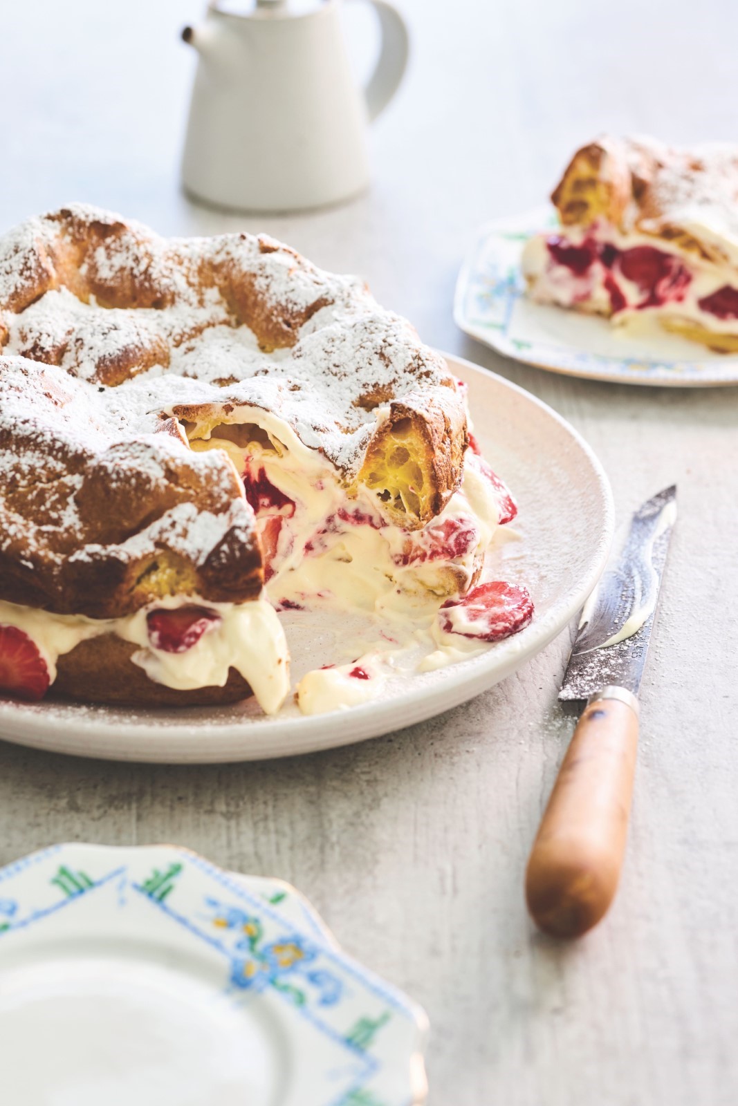 To assemble the cake: Place the springform ring only on a serving plate and place one of the choux discs, perhaps the one least puffed up, into it. Spoon over half the custard cream mixture, scatter over strawberries (some can be left to serve alongside the dessert) then the remaining custard cream. Cover with the second choux disc press a little bit to secure it. Chill for 2-3 hours or overnight.