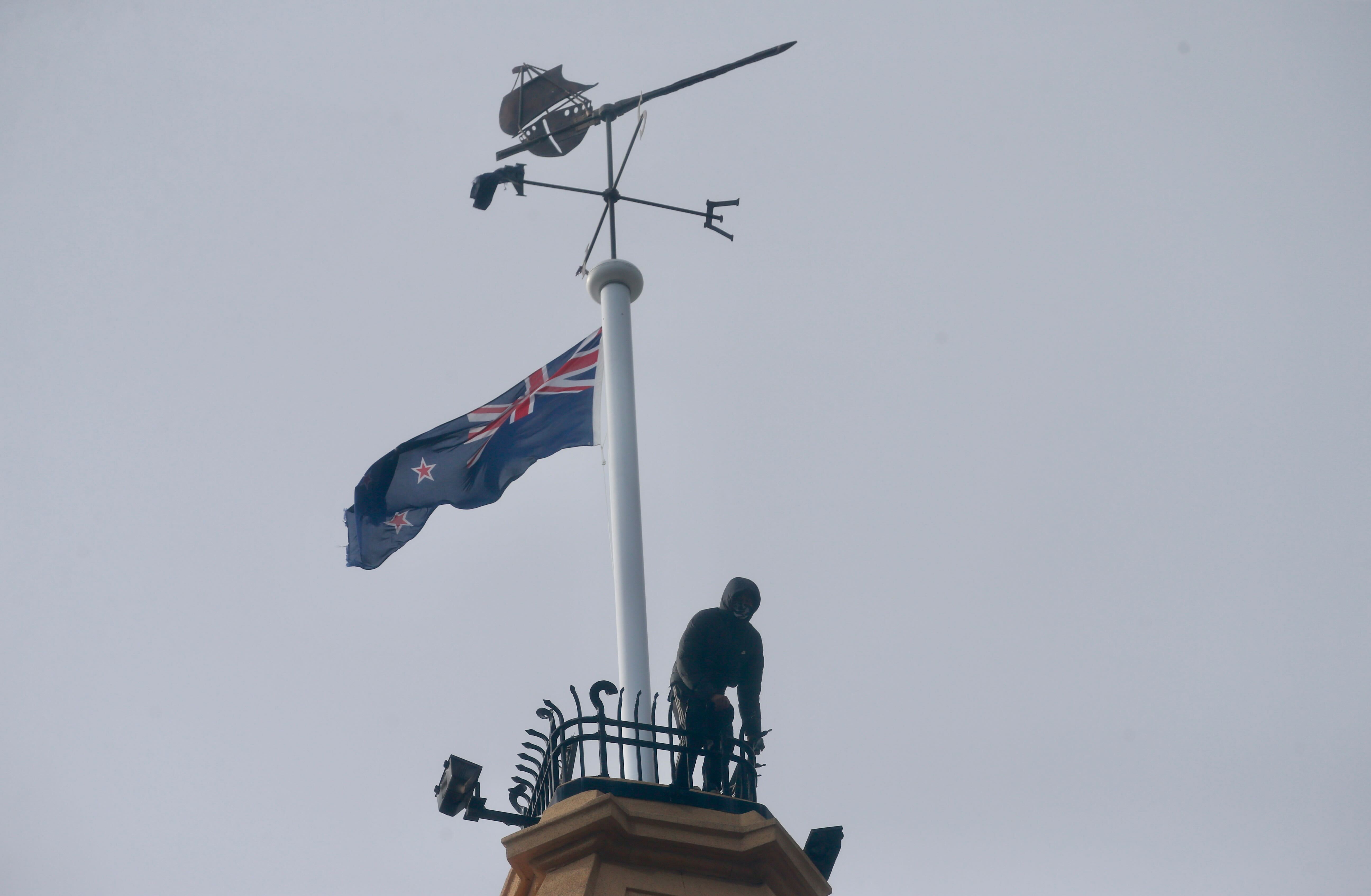Man who scaled Auckland ferry building was on bail; being hunted by police