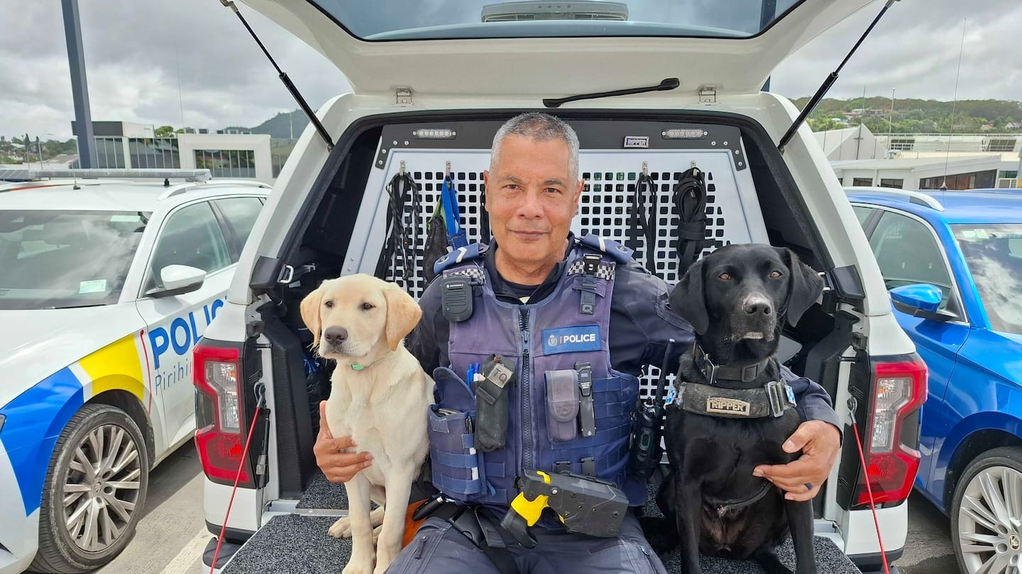 Sunday, 7 December 2025, 11:27amSenior Constable Patrick Derbyshire with detector dog Ripper and her apprentice, 17-week-old puppy, Kai. Photo / Brodie Stone Princess...