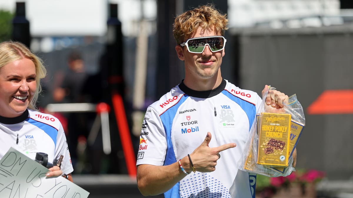 Watch: Liam Lawson gifted Whittaker's chocolates by Kiwi F1 fan