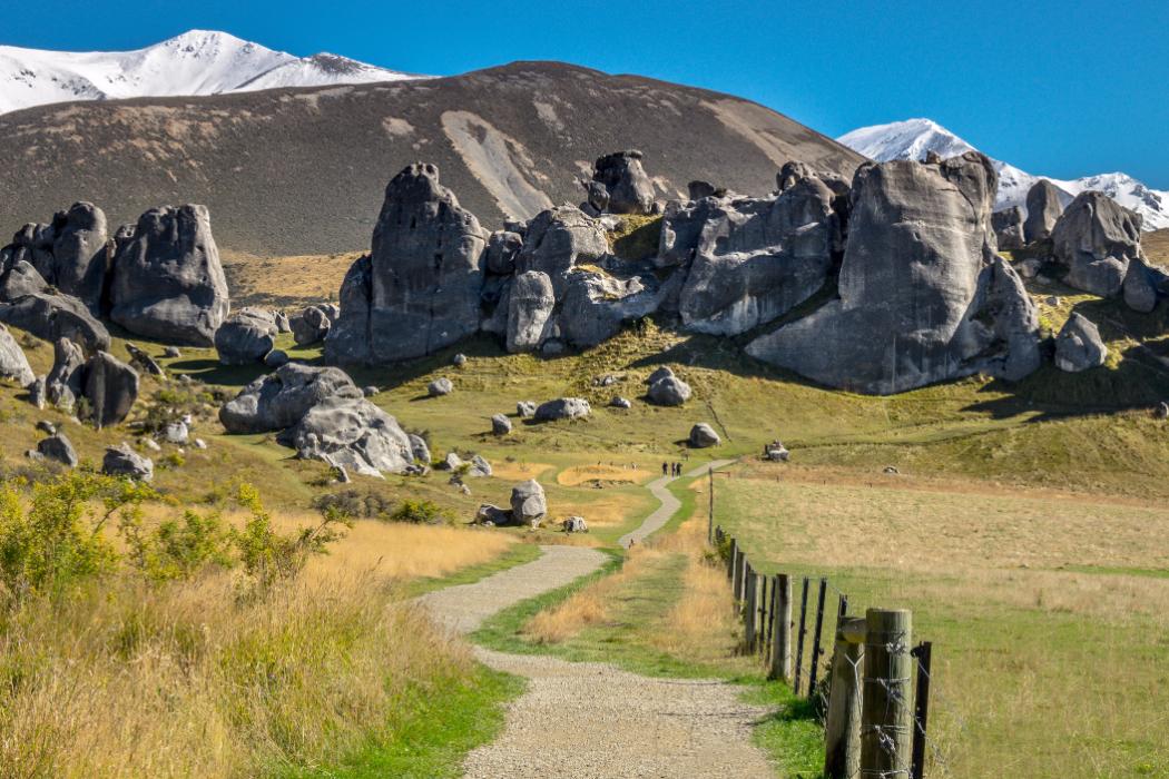 Beyond Springfield, the paddocks and pivot irrigators give way to tussock-mopped foothills of the Southern Alps, rolling country and majestic alpine views, as you haul your way up Porters Pass – a cherished haunt for weekend daytrips offering free family fun in freshly fallen snow, at a height of 939 metres. Just beyond Porters Pass, enjoy a lakeside stroll, wrapped in alpine majesty at Lake Lyndon. Back on the highway, the Castle Hill Basin unfurls its splendour, accentuated by one of the road trip’s biggest headliners, the spell-binding limestone rock formations. In recent years, the site has captured the imagination of global travellers, as scenes from the 2005 blockbuster, The Chronicles of Narnia: The Lion, the Witch and the Wardrobe were filmed here. Kura Tāwhiti/Castle Hill was once under a large, shallow inland sea that began to fill in about 30 million years ago. Pressure over time caused extensive uplift, folding and faulting of the Torlesse and Craigieburn ranges.