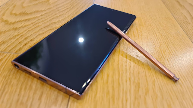 The back of the Note 20 Ultra has what Samsung describes as a "satin" finish - I really love it because it doesn't pick up fingerprints anything like as much as all the other glass-backed phones we've seen on offer for the last few years. The Samsung logo is embossed into the glass and you can literally feel it when you run your fingers over it. Yes, this is a classy operation to be sure. My major criticism, and I fear it's one I'll have of many phones to come, is that damn camera module. Just like on the S20's, the Note 20 Ultra's triple lens array sticks out clumsily, sharply and annoyingly. I can't wait for phone-makers to make these things flush with the back again. In the meantime they're gathering dust and pocket lint ad infinitum.