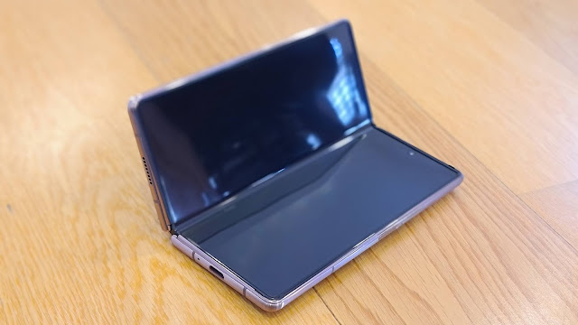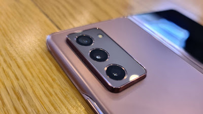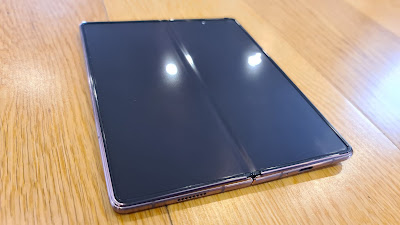 While there are just two colour choices, Mystic Bronze and Mystic Black, this time Samsung gives you the option to swap out the hinge colour when you order for silver, gold, blue or red. This comes with the Samsung logo embossed into it and conceals a new cam-based system that allows you to operate the phone in "Flex Mode" - half unfolded at an angle of your preference for a number of genuinely useful reasons. Mostly this would be for shooting or viewing pictures or video without a stand or tripod and we'll get into this in more detail shortly. Perhaps most usefully at all, it eliminates the need to join video-meetings via laptop as it can happily sit on a desk the same way. In fact, you'll look much better to everyone else because the front-facing camera on the Z Fold2 is likely to be light-years ahead of anything on a laptop or conventional tablet.