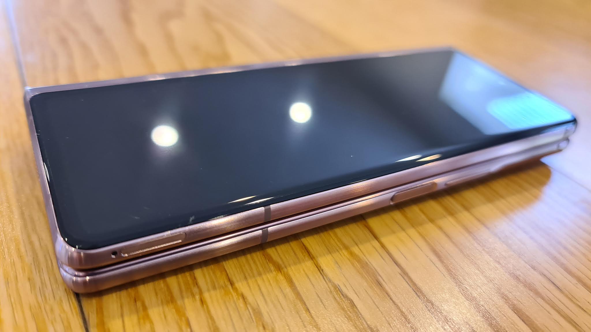 The handset still doesn't close completely flat and there's a lot of untidy-looking stuff going on around the hinge area; multiple layers of metal, plastic and glass giving an impression of clunkiness rather than elegance, which is a real shame as Samsung's new Mystic Bronze colour is definitely a winner and the phone itself delivers on pretty much all it promises. Starting with durability - alright, I admit it; I've dropped this $3400 phone not once but twice and I can't find any discernible damage - other than to my heart-rate.