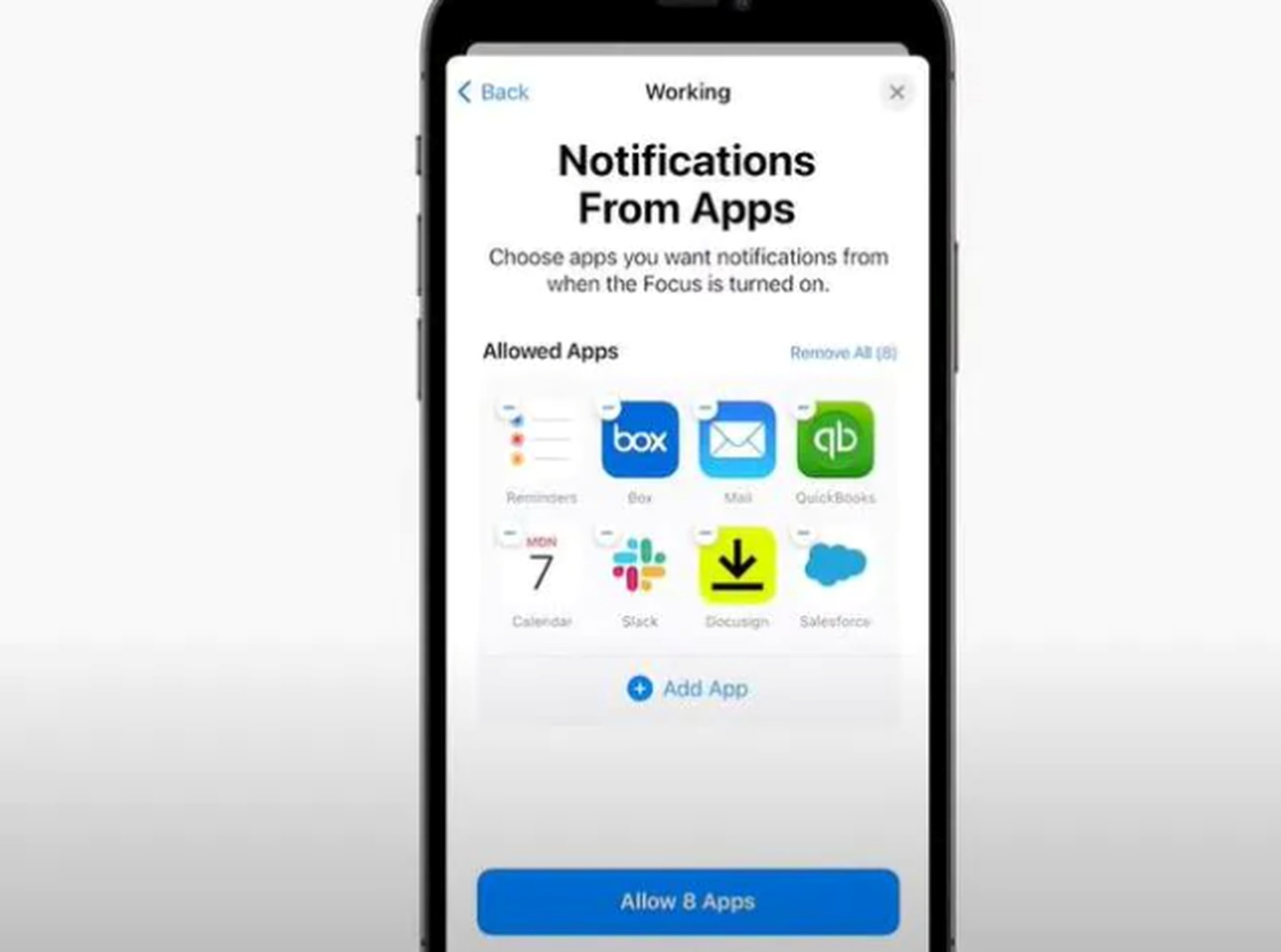 You can customise your focuses, selecting which apps are able to notify you while they're turned on. (Photo / Apple)