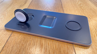 The watch stand can be used flat and also pops up to enable your watch to be viewed as a bedside clock. The only thing I don't understand is why the middle of the watch stand has to be white. This seems kind of garish in comparison to the rest of the Trio Pad's muted tones. Maybe there's some proprietary Apple tech involved that forbids it to be any other colour. Interestingly, non-Apple phones and earbud cases will charge just as effectively and in a nice touch, the compact 24W power brick included in the box includes adapters for all international power points.
