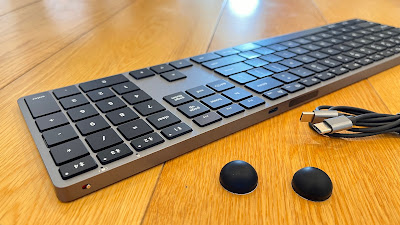As its name suggests, the X2 is backlit, with several levels of brightness. Bluetooth pairing a simple process, holding down one of the four pairing keys to put the keyboard into pairing mode. That's right; you can use this keyboard with up to four different devices - doesn't have to be an iMac, maybe you use your MacBook with an external monitor when you're at your desk, making the X2 the perfect keyboard to go with it. There's even a set of rubber feet you can stick to the base to raise it to a more ergonomic angle if that's your preference.Â