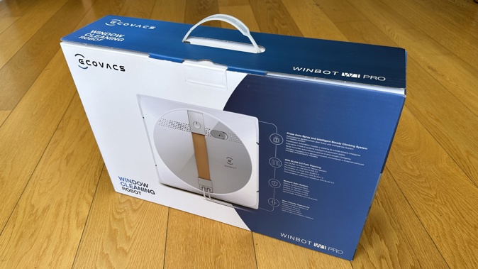 In fact, the WINBOT W1 PRO looks quite a bit like a DEEBOT - except it's square, has a long power cable connected to it and a leather handle on the top. Strangely, for something capable of such a complicated task, there really isn't much to it; there are two microfibre cleaning pads included in the box. You moisten one of these under the tap, velcro it on, fill the reservoir with the specially formulated cleaning fluid, plug it in and you're good to go.
