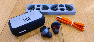 What I mean by that is I experienced an almost perfect seal, instantly. There's no Active Noise Canceling function built into these earbuds but there doesn't have to be; the seal is so good almost all ambient noise is blocked out. In fact this works so well, JBL has included TalkThru and Ambient Aware modes if you do need to let some of the outside world in. TalkThru mutes what you're listening to and feeds you everything else so you can have a conversation with someone, while Ambient Aware adds outside sounds into your mix which is a good safety feature if you need to listen out for traffic or hear commuter announcements. Both these modes are easily toggled through by single-tapping the left bud.