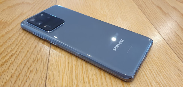Yes. That's right. A simply enormous 6.9" display with just the tiniest single punch-hole for the forward-facing camera, this year placed in the centre, which is possibly slightly less distracting than the corner punch-hole on last year's Galaxy S10. The screen is sublime. Increase the refresh rate from 60Hz to 120Hz and it gets even sublimer. Operations become smoother, gaming and video clearer. The settings menu warns the higher refresh rate will cost you some charge but the drain wasn't as bad as I was expecting. This is probably due in no small part to the S20 Ultra's upgraded battery, which is definitely no small part.