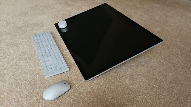Another optional extra is the Surface Dial, a new innovation to help get the most out of this splendid machine. Again, made from aluminium, the Dial is roughly the size of a can of tuna and can be used either on your physical desktop, or you can bung it on the screen itself. The base is some kind of slightly sticky, rubbery substance which keeps it from sliding around. (In fact, try not to drop it on the carpet. There's definitely a fluff factor here) What does this dial do exactly? Depends on which program you're using at the time. Pushing it down gives you the available options; another scrolling device when you're browsing, pen/tool selection in drawing apps, shuttling back and forth for video production etc.