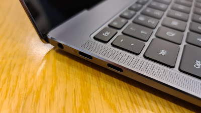 Battery life was another minor letdown for me. Although the website claims "up to" thirteen hours of continuous video playback on a full charge, I certainly never got anywhere near that with my standard, everyday use. Luckily, the 65W pocket charger works quickly and is very small, so is easy enough to carry with you. Additionally, because the Matebook X Pro uses a standard USB-C connector to charge with, you can juice up your phone and other devices with the same charger which is nicely convenient. In fact there are two USB-C ports, along with a headphone jack and a standard-sized USB-A port on the other side. I'm pleased to see there's still one laptop maker out there who acknowledges people like to be able to plug things in sometimes.