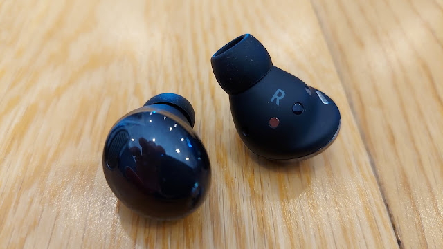 This is a different form factor again; more like the first two models than the beanie versions from last year. More like but not exactly like. While the Buds Pro are definitely a return to the original sealed, in-ear design and a departure from the open-ear Buds Live, they're quite a different shape; more contoured and streamlined than the Buds and Buds+ although a similar size. Available in Phantom Black, Phantom Violet or Phantom Silver, they come with three ear-tip sizes to ensure a secure, comfortable fit. I've found all the Samsung Buds to be a great fit and although the Pros don't come with swappable fins this time, their new shape takes that into account and they're still super snug, even when exercising.
