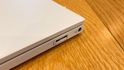 There's also a USB-C, a headphone/mic jack and a barrel-socket for the compact AC-adapter. Not that you'll need to take that adapter with you as the Aero can charge via the USB-C as well. The magnesium-aluminium alloy chasis is what keeps everything so light and also lends a super-modern look and feel to the whole setup - especially given I've been sent the Ceramic White variant. So cool.