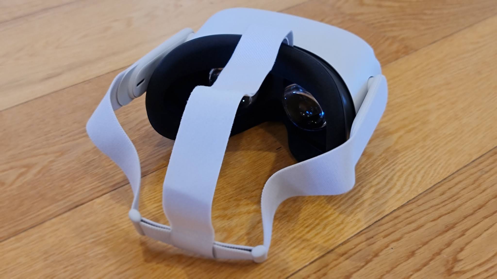 To start with, it looks more friendly than some of the all-black, multi-cabled options we've seen before. The Quest 2 headset and its Touch Controllers are an attractive off-white colour, with a comfortable, three-way adjustable, fabric head strap. There's really not much to see from the outside; other than the four small cameras, there's a power button with tiny status LED on the right-hand side, USB and 3.5mm AUX-in sockets on the left and a volume rocker underneath - all easily located by touch when wearing the headset.