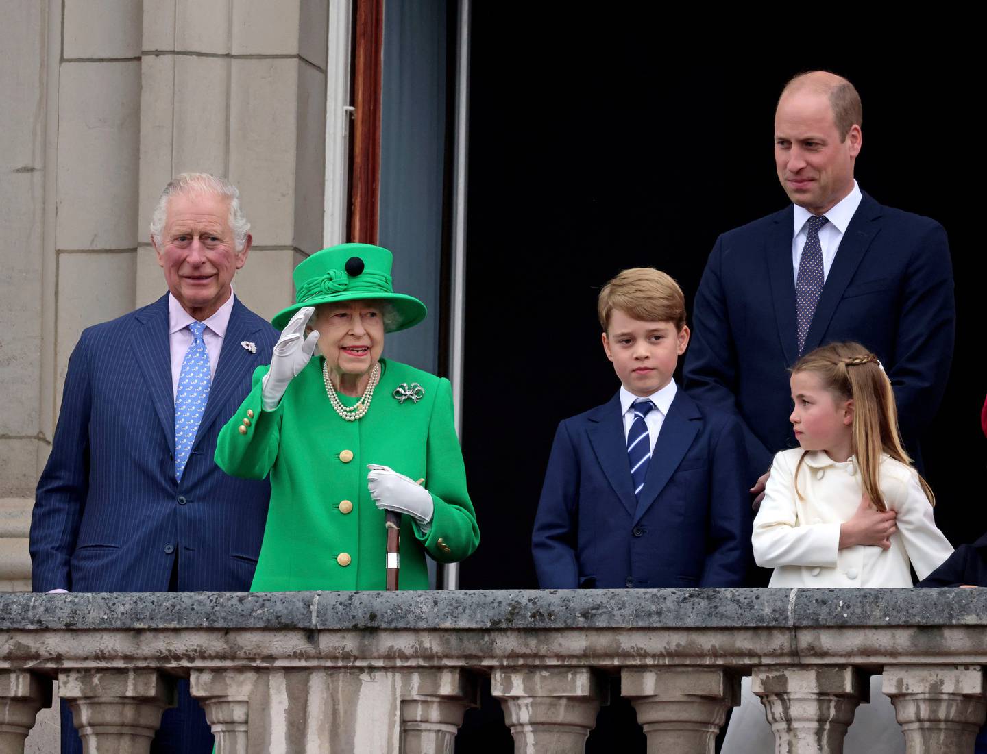 Prince Charles, Queen Elizabeth II, Prince George, Prince William and Princess Charlotte on the balcony during the Platinum Jubilee Pageant. Photo / APÂ