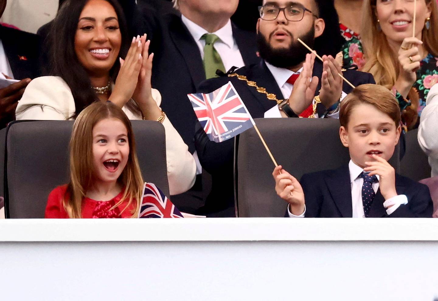 Charlotte and George enjoy the entertainment at the Party at the Palace, celebrating their great-grandmother's Platinum Jubilee. Photo / APÂ