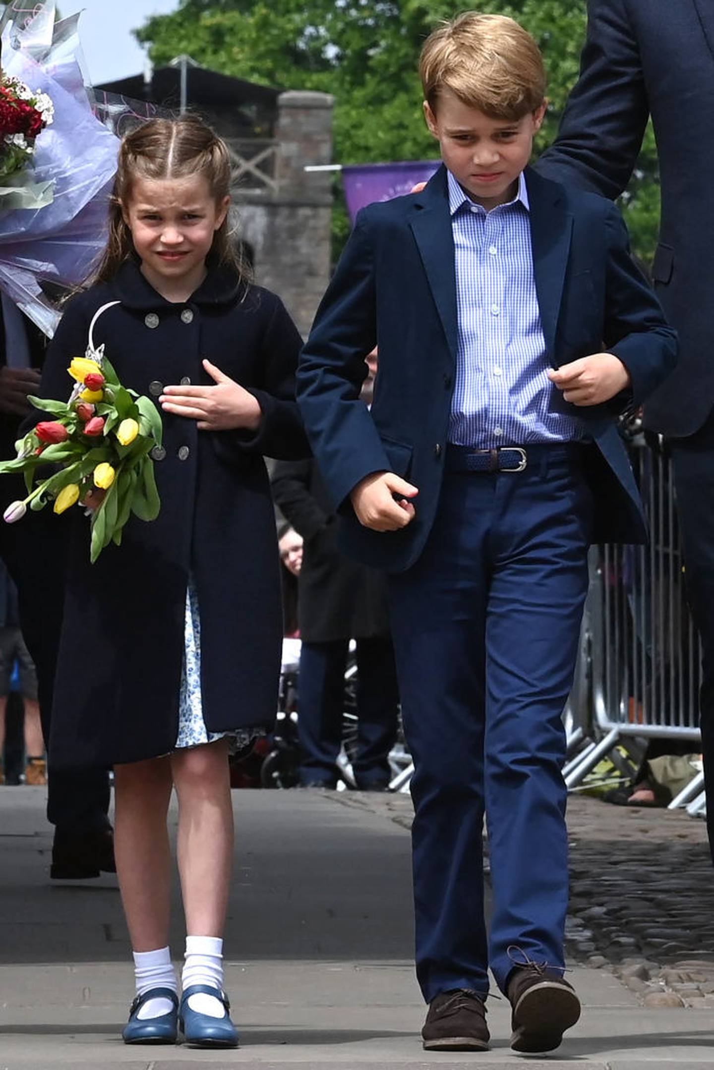 Dressed in a navy coat paired with white socks and blue Mary-Jane shoes, Charlotte carried a bouquet of tulips as she walked alongside big brother George, 8, during the engagement.Â