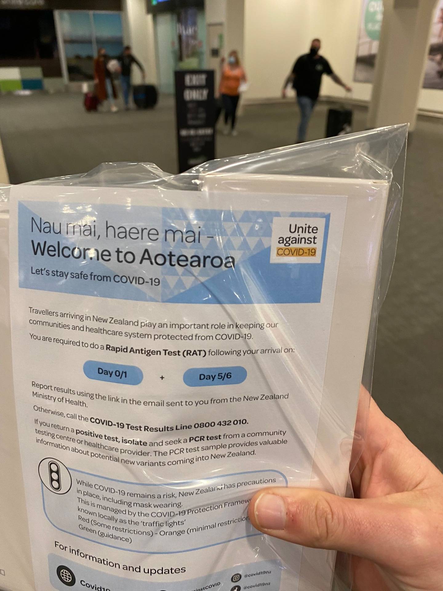 Passing through biosecurity and arrivals, a New Zealand customs and border worker handed me a 'Welcome Pack' of three RATs and instructions.