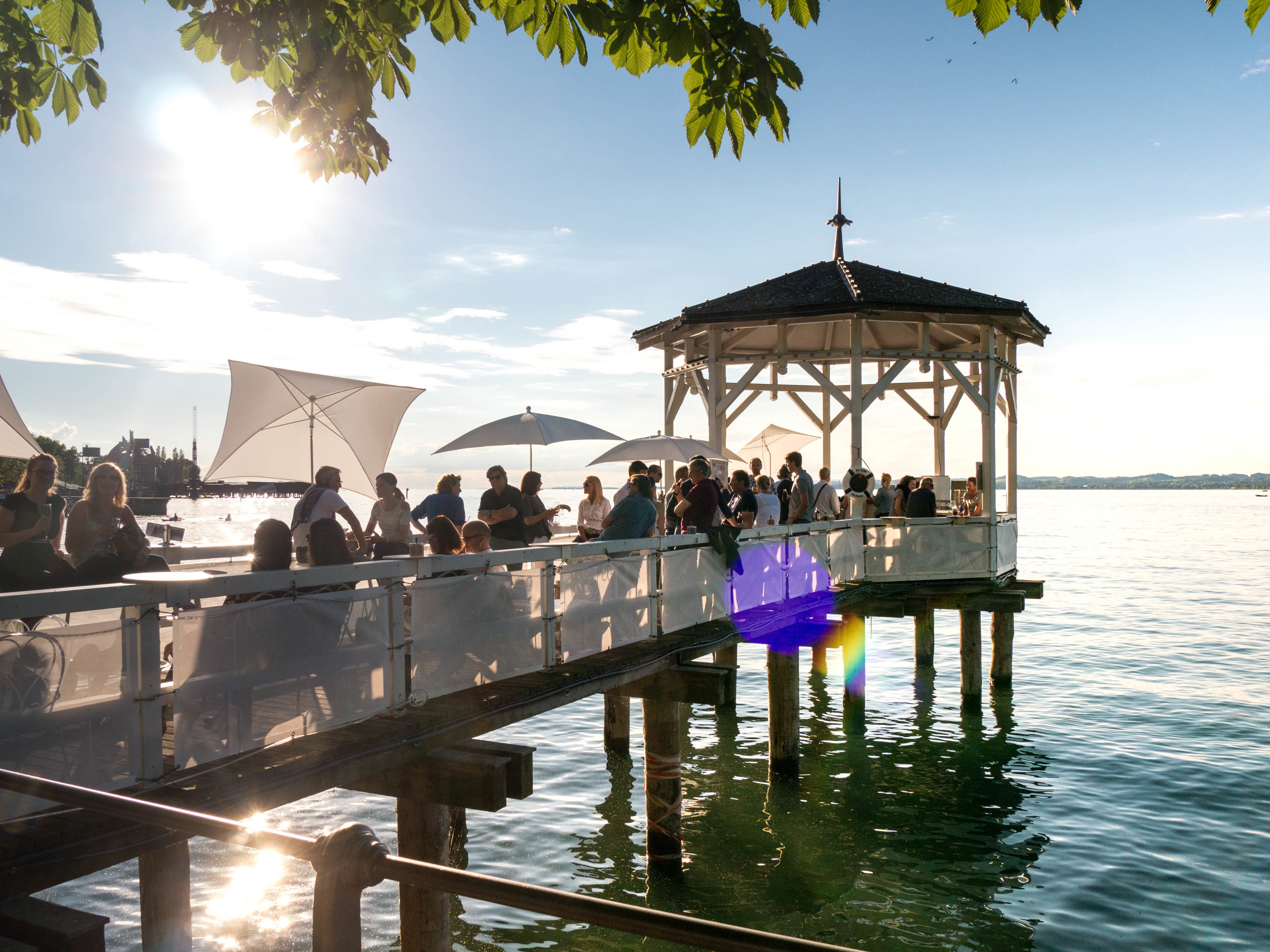 trek up the slopes. Pfänder is a must-visit for the enormous views over Lake Constance and the Alps. On a clear day, some 240 mountain peaks are visible, making it one of Austria’s most prized lookout points. Back down by the water, I loved taking aimless strolls around the picturesque lakefront promenade, edged with attractive al fresco eateries, vintage piers and blazing flowerbeds. Bregenz comes with the bonus of facing the north west, which means stupendous sunsets, on the shores of Lake Constance. Grab an ice cream and stroll along to the prime viewing spot, the Sunset Steps – known as Molo to the locals.