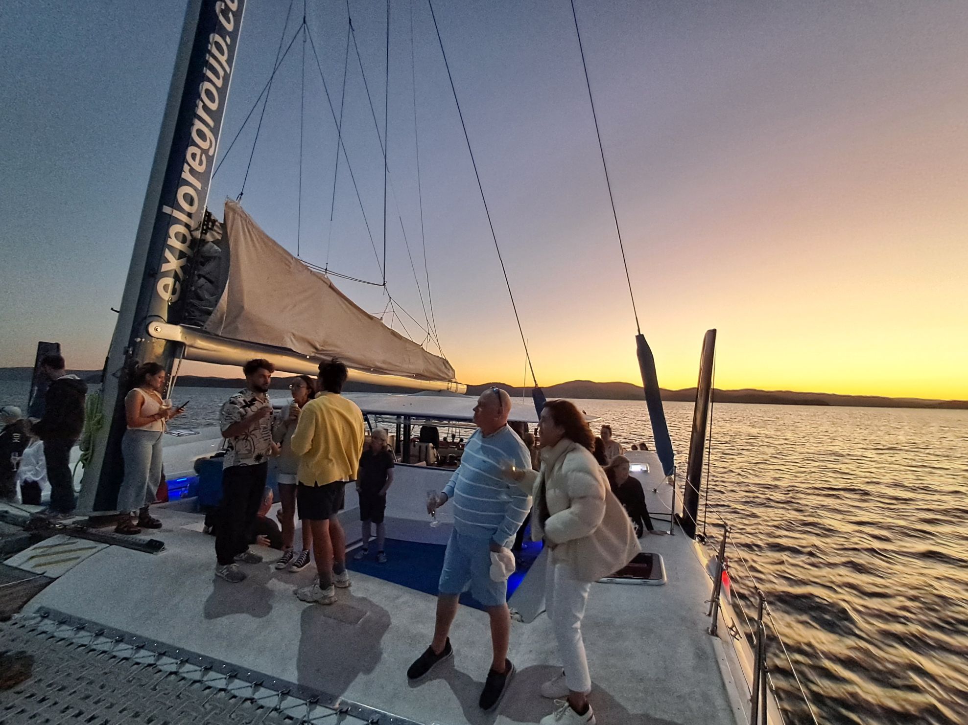 Yes, what was billed as a sunset cruise spontaneously doubled as a whale watching cruise, as an extroverted pod of humpbacks turned on an enthralling aquatic display, just 200 metres off the shoreline. Humpback Whales migrate from Antarctica to the protected, warm waters of the Whitsundays to give birth to their calves and nurse them, and hang about in this playground, between June and October. After ogling these majestic creatures slapping their fins and tails on the surface of the water, and clearing their blowholes, the solar God had a rather tough act to follow. But as more drinks and nibbles flowed, twilight duly took hold, setting sun’s mandarin glow torched the land and sky in all its gilded glory.