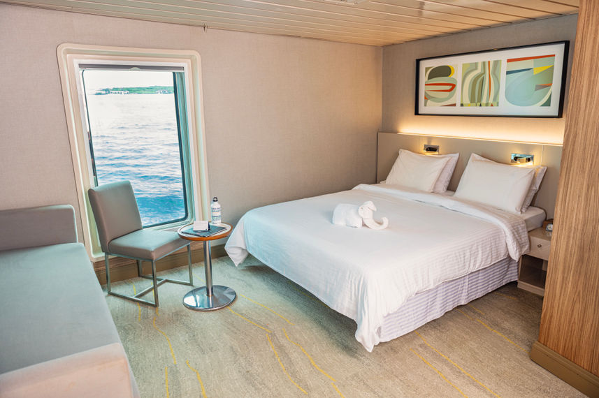 Recently refreshed from tip to toe, this elegant small ship is perfectly proportioned for Galapagos cruising, with a capacity for just 48 guests and over 30 crew, delivering an ultra-attentive, personable experience. My generously sized cabin had a fresh, soothing design palette, complete with floor-to-ceiling window and superb ensuite. The daily towel art was extra-imaginative. Despite being an expedition ship, La Pinta certainly doesn’t skimp on luxury comforts, adorned with sophisticated yet relaxed decks and lounges.