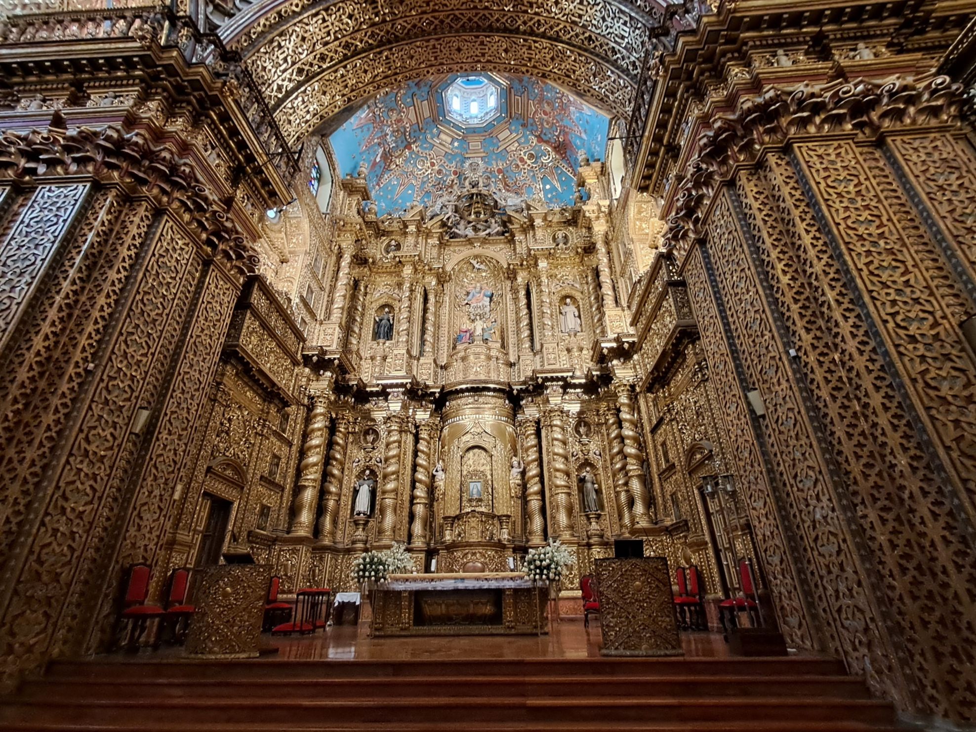The complex previously had its own brewery (now a museum) which produced the very first beer in the Americas. But it’s the main church that swept me up in sight-inducing awe. Heavily gilded and intricately decorated, its lavish baroque splendour is overwhelming. We climbed up the belfry for a sweeping view across the Old Town. Beneath the church, a series of small shops in the basement sell a fiesta of religious goods like incense, rosary beads and ceramic figurines, including Jesus dressed as a firefighter. There’s no denying Quitenos’ faithful fervour! Across on the other side of the plaza, La Compañia Church is another eye-popping baroque masterpiece, which took 160 years to complete. Beyond its intricately carved volcanic rock façade, its decorative interior bedazzles in a swirl of Spanish, Moorish and Inca architectural styles.