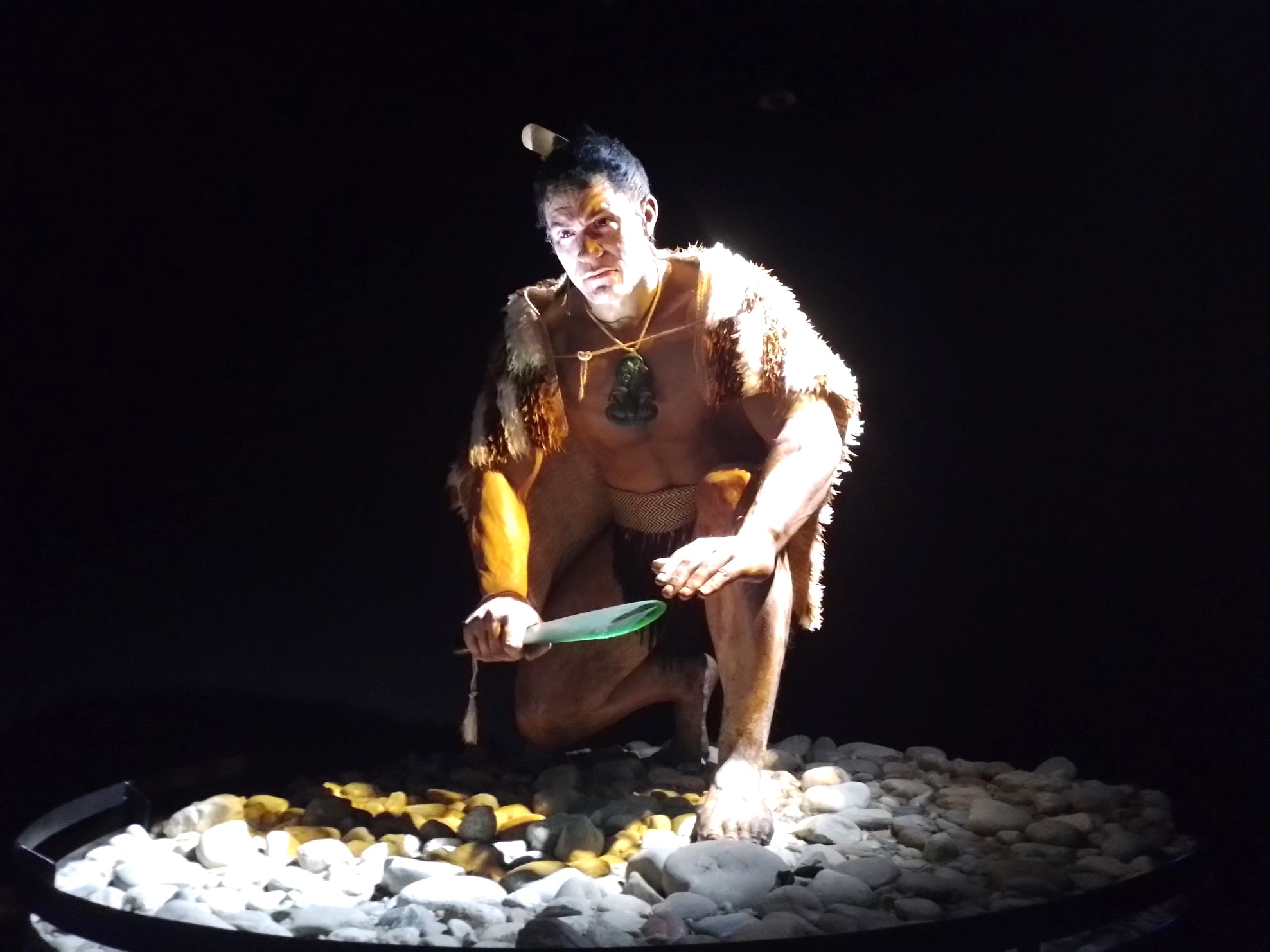 If you’ve marvelled over those enormous sculptures in the Gallipoli exhibition in Te Papa, you’ll be equally awestruck by Māwhera’s staggering centrepiece, a giant sculpture of Tūhuru. My heart skipped a beat as I gazed up-close in awe of this hyper-realistic representation of the region’s renowned warrior chief. This super-sized sculpture is more than double the size of a human. You expect him to spring into life! Tūhuru has been magnificently adorned with woven accessories and the world’s largest known pounamu hei tiki. The pendant weighs 8kg!