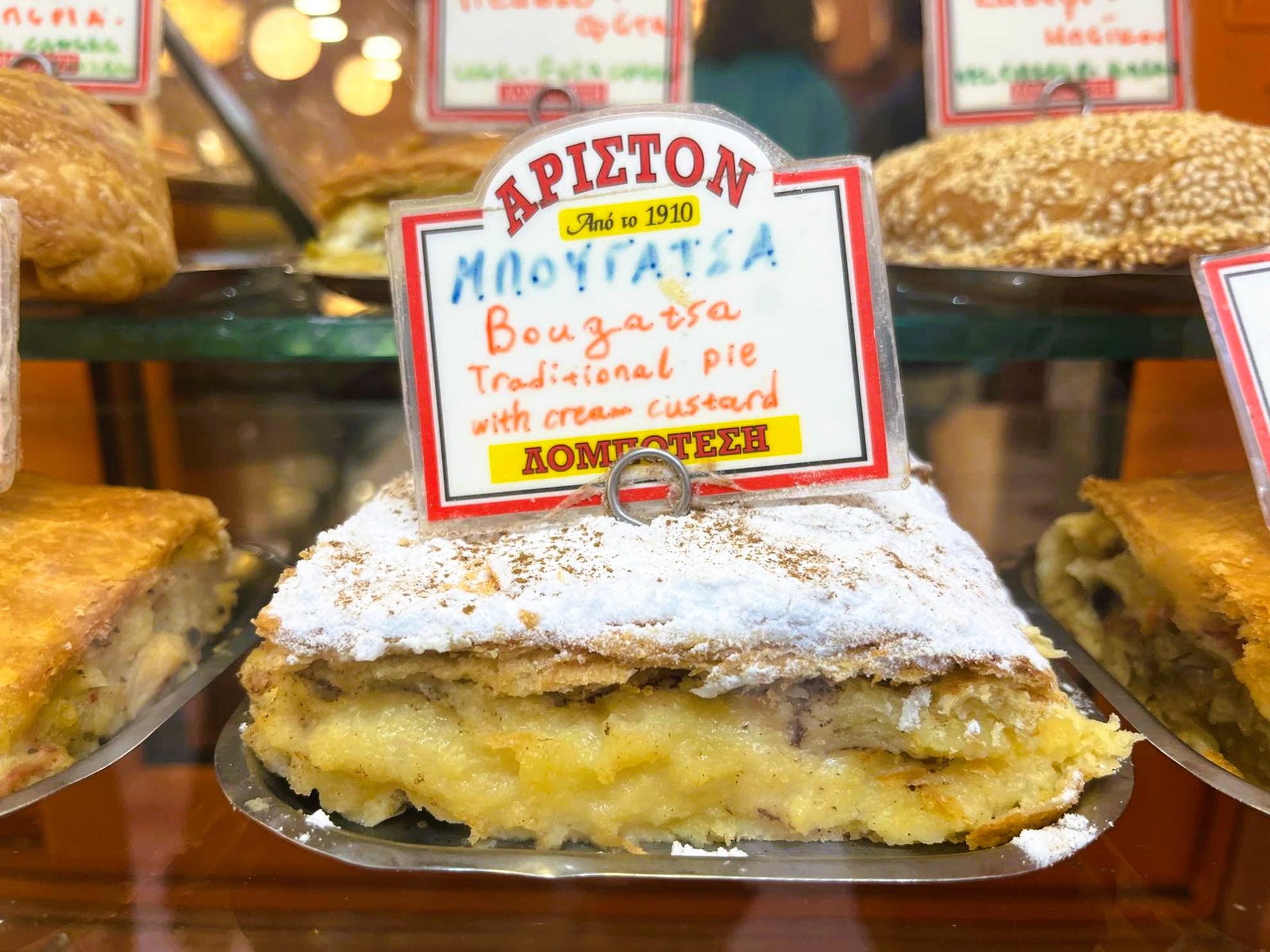 The Greek word for pie is pita - not to be confused with pita bread. An extra word is typically added in front of pita, so you get tyropita (cheese-pie) or spanakopita (spinach and feta pie.) You’ll definitely want to sink your teeth into some of these pies, followed up by one of my favourite new Athenian treats, bougatsa. This traditional phyllo pastry pie is filled with cream custard and topped with icing sugar. They are deliriously good – best served warm. Another specialty that woos the crowds to Ariston are kourou pies – which are placed inside a large, rectangular, glass incubator like precious premature babies. They are made with a solid, pastry-like dough with a hearty feta filling and have an almost yellow glow, because the dough is butter-rich.