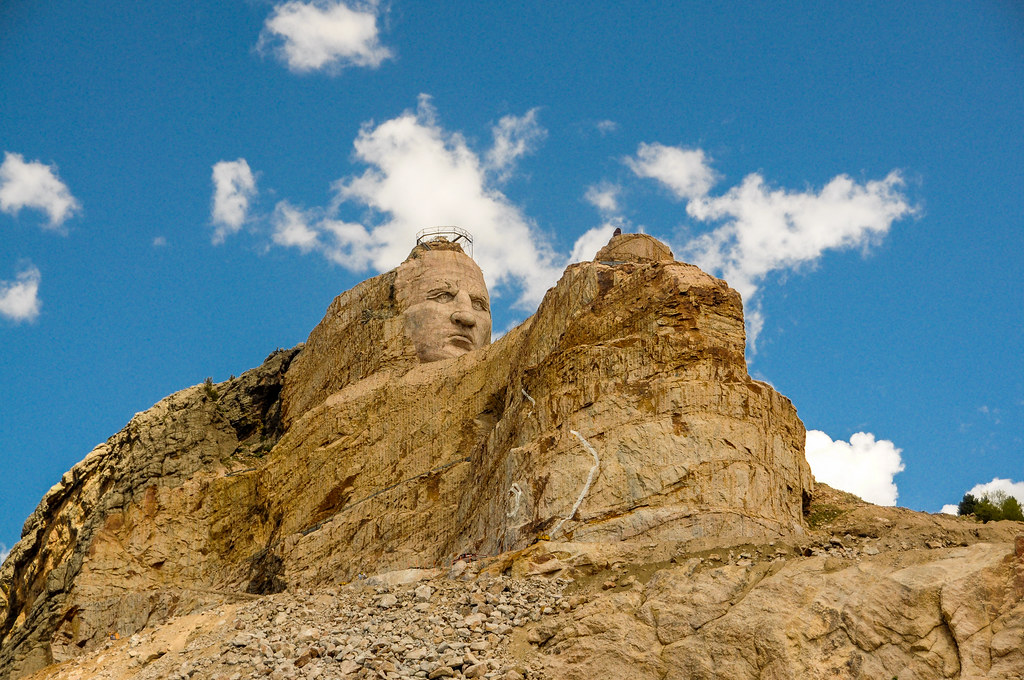 His eyes alone are five metres wide. Self-taught sculptor Korczak Ziolkowski started this memorial in 1948, knowing full well that the immensity of the project would not be completed in his lifetime. After his death in 1982, his family have carried on the project, with some of his children and grandchildren actively involved today. Technological advances have given hope that the astronomical project will completed in several decades time. The dimensions are staggering. Nearly two rugby fields long and two rugby fields wide, all carved out of the granite cliff of Thunderhead Mountain, 6000 feet above sea level. Â