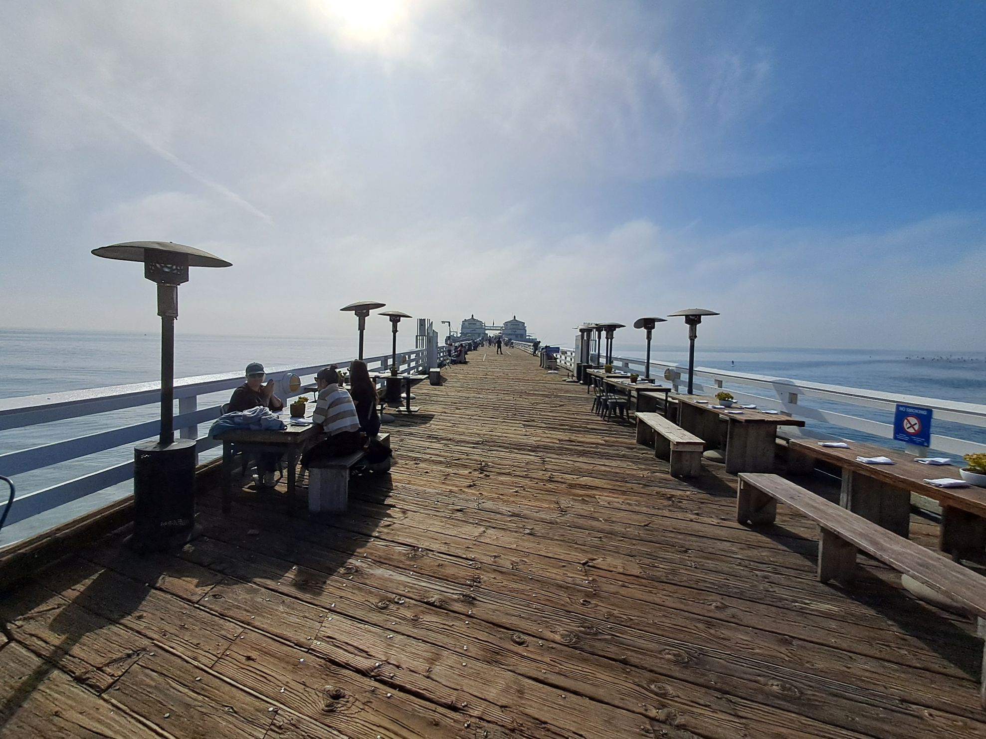 PCH from just north of Santa Monica to Malibu Pier currently remains closed to general traffic for debris removal and gas line leak repairs. But thankfully you can access Malibu Pier and everywhere west of the Pier, by taking the inland 101 route from Los Angeles, via Calabasas. Malibu Pier is one of the coast’s great glories, a magnet for leisure seekers, from near and far. It’s bracketed by Carbon Beach on one side and Surfrider Beach on the other. The Pier was first built 120 years ago, becoming publicly accessible 90 years ago. The cape Cod-style twin towered buildings at the end, housing a bait and tackle shop and an eatery were added in the 1940s – which now houses the Malibu Farm Café. Farm fresh, local & organic ingredients are to the fore here, whether you want to grab and go from the counter, or soak up the seascape at First Point, on the reclaimed wooden picnic benches.
