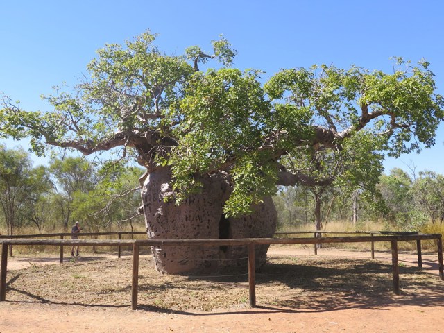 Their back-story is fascinating, as it’s believed they descended from Madagascar, when boab seeds drifted across the Indian Ocean millions of years ago, to colonise the Kimberley. 7km out of Derby, we followed the signposts to the Boab Prison Tree, adjacent to the Gibb River Road turnoff. The Boab Prison Tree is a monumental, super-sized specimen, which has been dated as over 1000 years old.