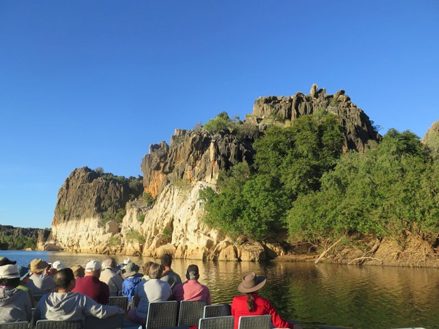 Drifting through the gorge on a cruise, the water line bleaching was strikingly conspicuous. Visiting in June, early in the dry season, the river resembled a far more sedate ribbon of water, as we glided by the 30 metre high cliff walls, and the multi-coloured limestone strata. A frisson of delight regularly rippled through our group, when we spotted freshwater crocodiles sunning themselves, on the water’s edge.