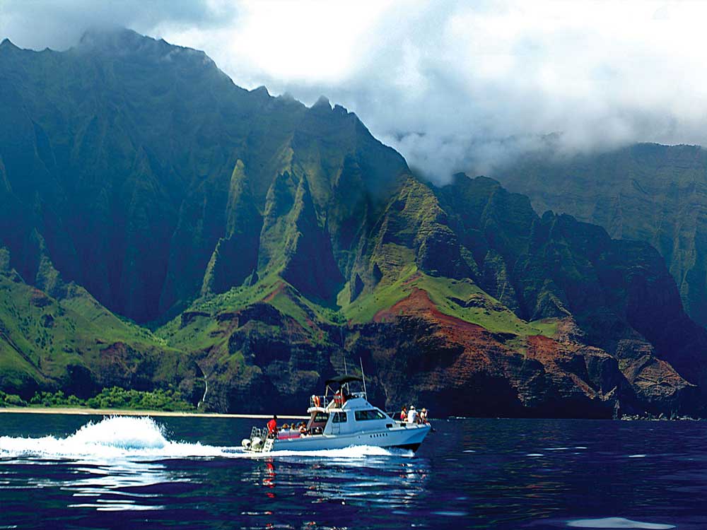 There are five navigable sea caves along the 17-mile coastline including the Open Ceiling Cave. This large hollowed out lava tube has a collapsed roof, which created a large, natural skylight. Further up the coastline is the Honeymooners Sea Cave. This one features a waterfall cascading about 100-feet down the cave’s right wall. Near the end of the coastline are the supremely isolated Honopu and Kalalau beaches. A dramatic natural rock wall between the two beaches features a 65-foot tall arch, under which you can walk. This Hollywood favourite appeared in the original “King Kong,” “Six Days Seven Nights” and the James Bond’s, “The Man With the Golden Gun,” in which a chopper flew through the arch. It’s truly a show-stopping encounter with a blockbuster coastline.