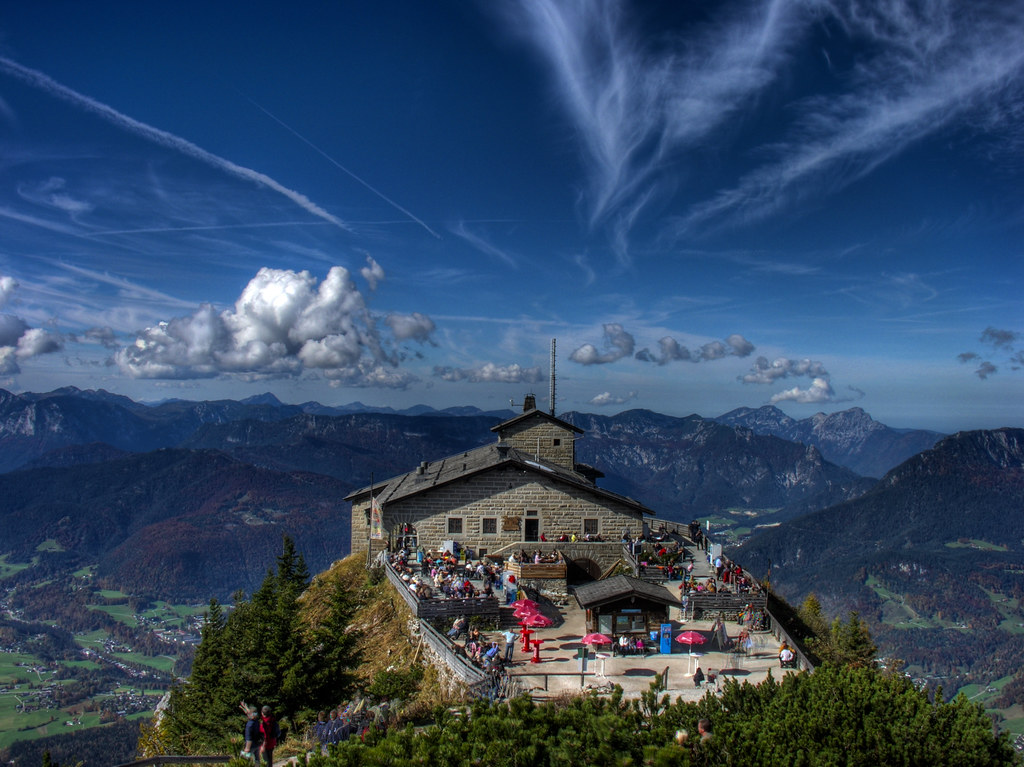 Eagle’s Nest was a 50th birthday present to Adolf Hitler from his inner circle. Perched alone amid spectacular alpine scenery, the lodge looms like a Bond villain's lair. An ornate brass elevator was built to whisk Hitler and his guests up the last 120 metres to the lodge, from the end of the mountain road. This building, which is now a summer restaurant, is one of the few undamaged monuments of the Hitler era. Today however it still offers a magnificent and unique view of the surrounding countryside, but also an opportunity to reflect on the abject horrors of its previous owner.