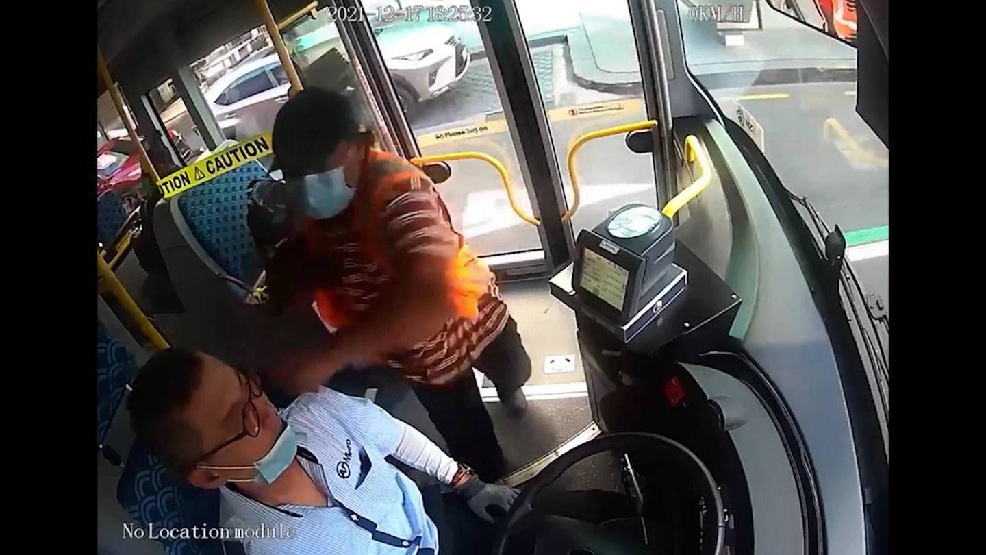 CCTV has caught the moment a bus driver was viciously punched in the head by an irate passenger, who was then kicked in the back by the dazed driver in retaliation.