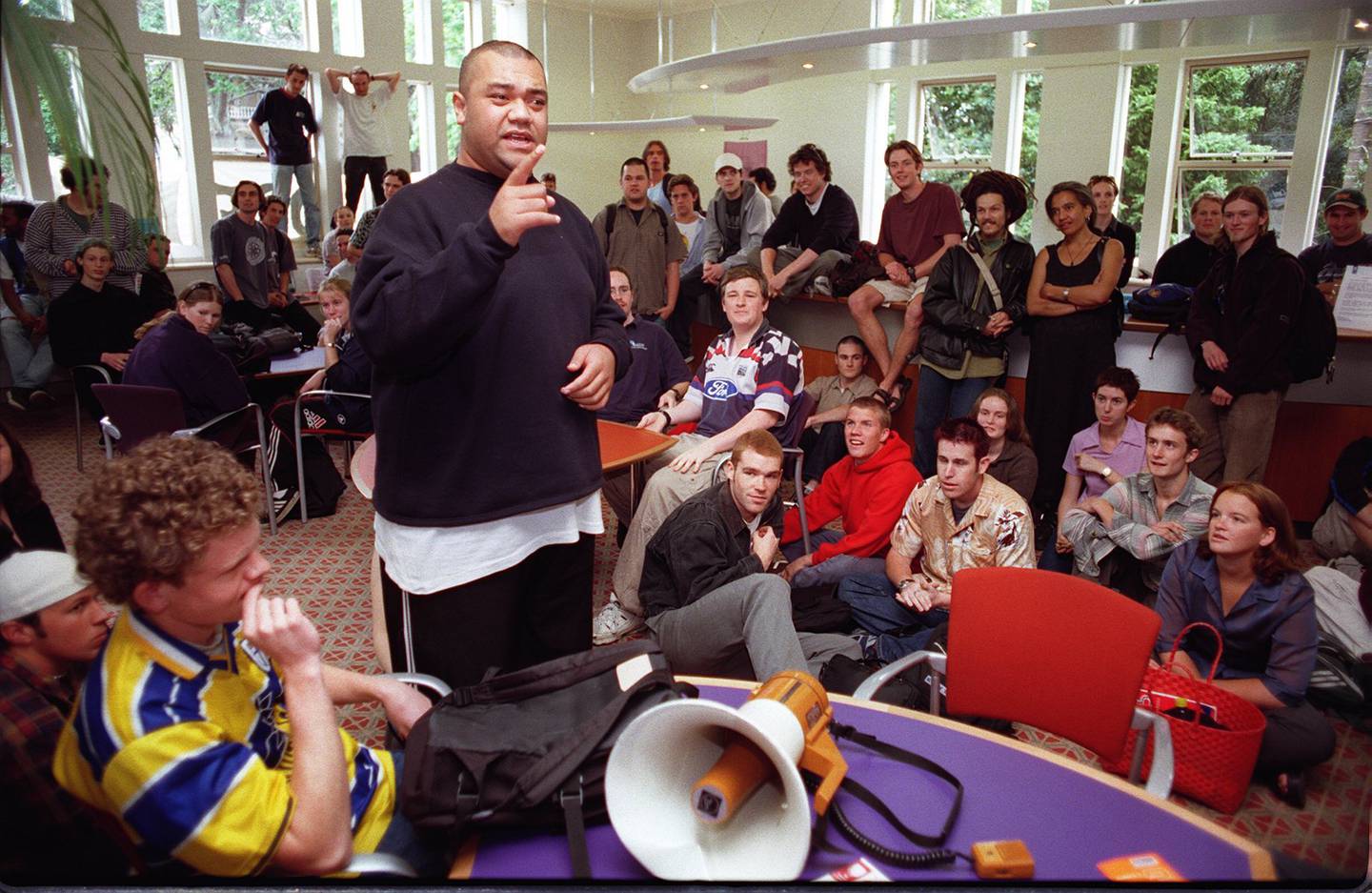 Auckland University Student Association President Efeso Collins addresses fellow students in 1999. Photo / Bastiaan Beentjes