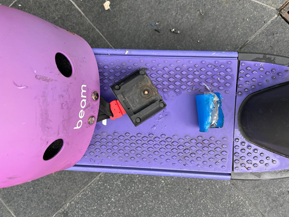 Battery debris and parts from the vehicle could be seen littered on the footpath next to the overturned e-scooter, and the helmet was no longer attached.