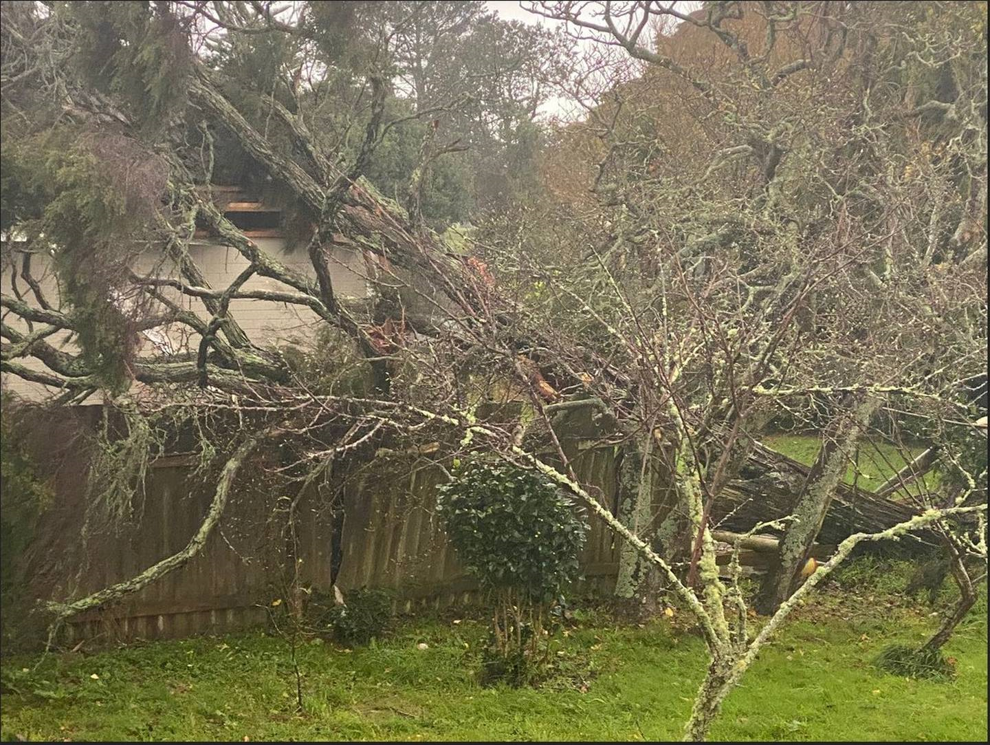 A tree rests on the roof of a house after coming down in south Auckland. (Photo / Twitter)