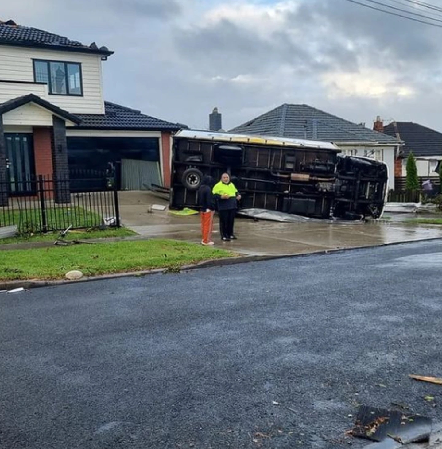 A truck lies on its side in a driveway, a home under construction has been destroyed and roofs have been pulled off houses. The power of the wind was so strong it has bent wrought iron fences.