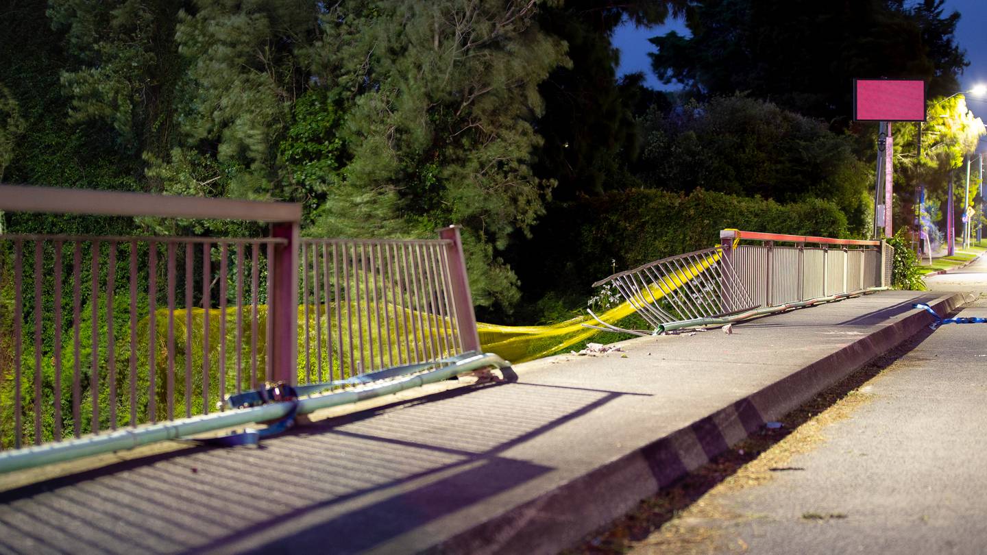 A vehicle crashed through the barrier of a bridge crossing over State Highway 1 in Manurewa at about 3.37am. Photo / Hayden WoodwardÂ